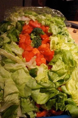 The other friends brought huge salad. This salad had bell pepper, broccoli, carrots, lettuce, tomatoes, cucumber. They also brought special salad dressing which they made from scratch. It was great salad.
